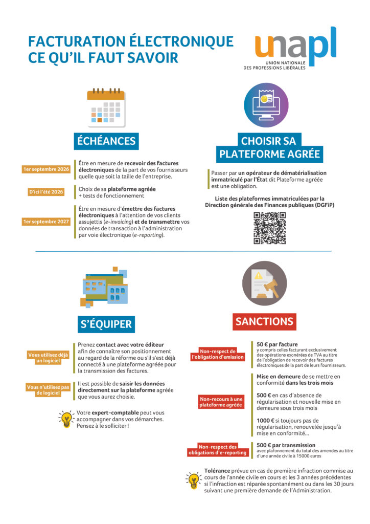 La facturation électronique devient progressivement obligatoire pour les entreprises, y compris libérales. Calendrier, choix de la plateforme agréée, obligations déclaratives et sanctions : découvrez l’infographie pour tout savoir.